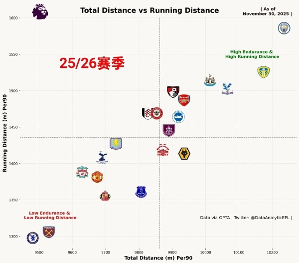 从统计数据可以看到,曼城是英超球队里人均跑动距离和冲刺跑距离最长的球队。瓜迪奥拉很重视跑动,塞梅尼奥最吸引他的地方,应该就是他在比赛中的覆盖面积和冲击跑频率。